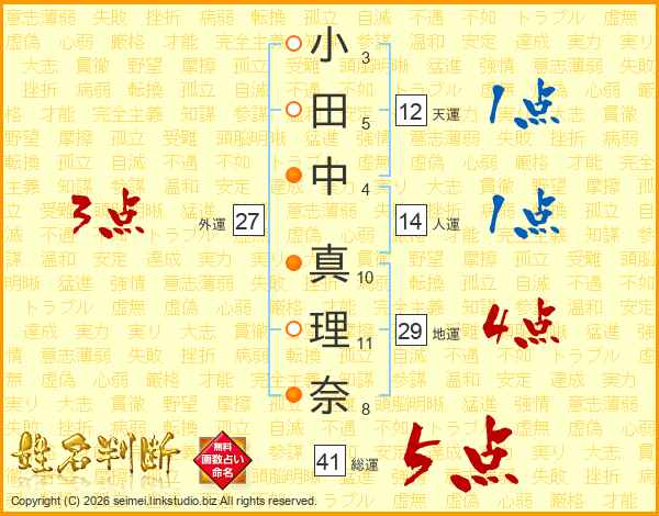 小(3画)田(5画)中(4画) 真(10画)理(11画)奈(8画)