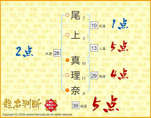 尾(7画)上(3画) 真(10画)理(11画)奈(8画)