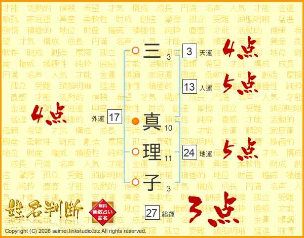 三(3画) 真(10画)理(11画)子(3画)