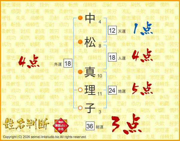 中(4画)松(8画) 真(10画)理(11画)子(3画)