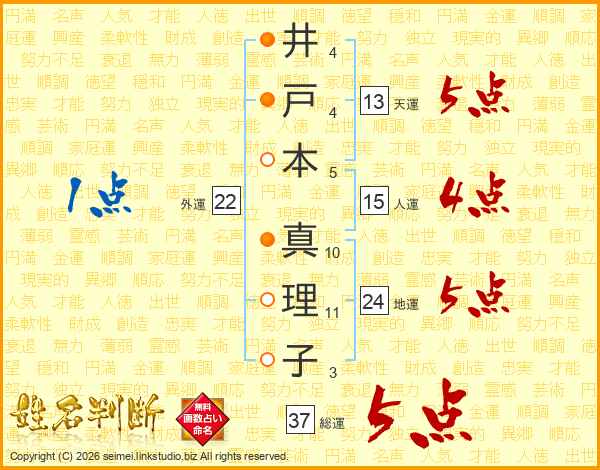 井(4画)戸(4画)本(5画) 真(10画)理(11画)子(3画)