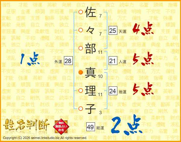 佐(7画)々(7画)部(11画) 真(10画)理(11画)子(3画)