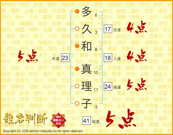 多(6画)久(3画)和(8画) 真(10画)理(11画)子(3画)