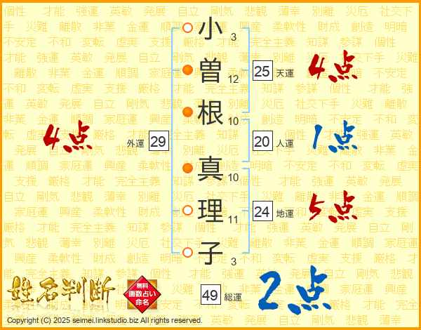 小(3画)曽(12画)根(10画) 真(10画)理(11画)子(3画)