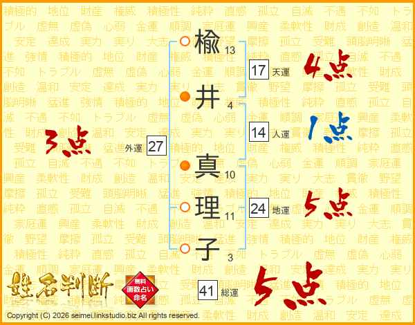 楡(13画)井(4画) 真(10画)理(11画)子(3画)