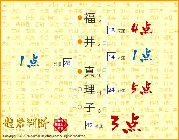 福(14画)井(4画) 真(10画)理(11画)子(3画)
