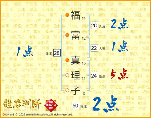 福(14画)富(12画) 真(10画)理(11画)子(3画)
