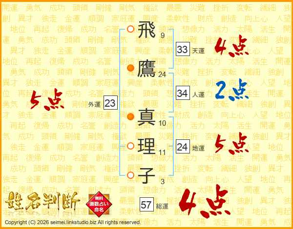 飛(9画)鷹(24画) 真(10画)理(11画)子(3画)