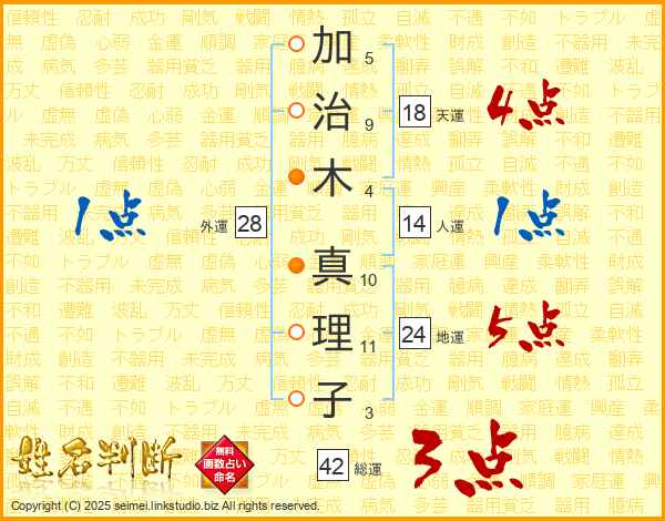 加(5画)治(9画)木(4画) 真(10画)理(11画)子(3画)