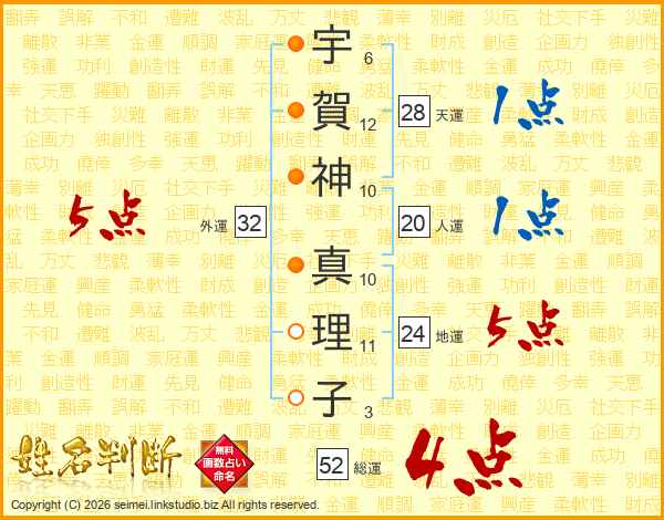 宇(6画)賀(12画)神(10画) 真(10画)理(11画)子(3画)
