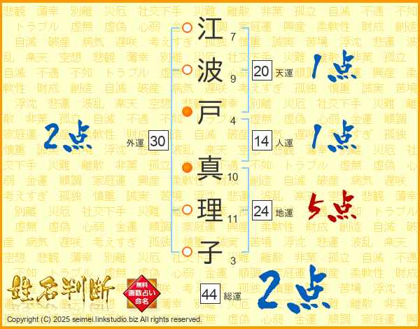 江(7画)波(9画)戸(4画) 真(10画)理(11画)子(3画)
