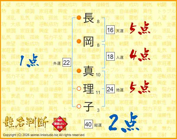 長(8画)岡(8画) 真(10画)理(11画)子(3画)
