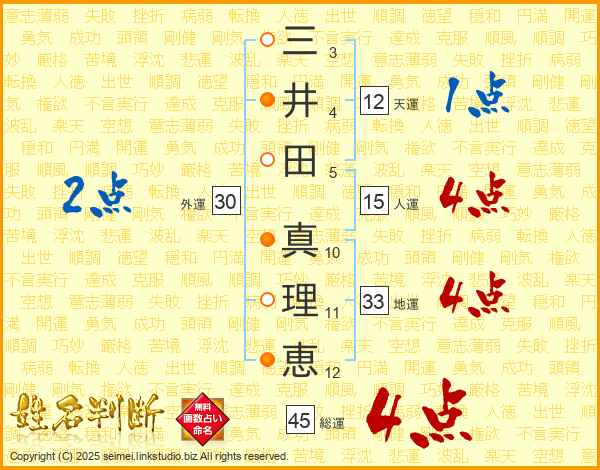 三(3画)井(4画)田(5画) 真(10画)理(11画)恵(12画)