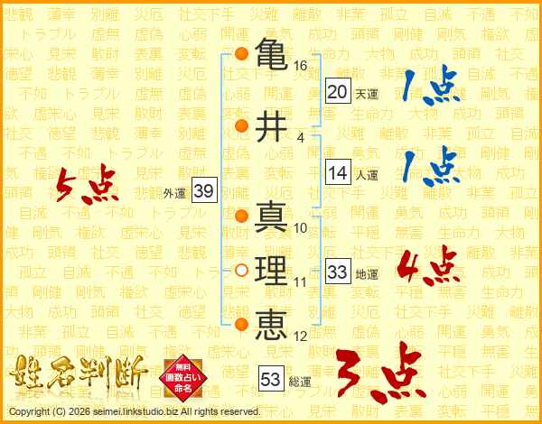 亀(16画)井(4画) 真(10画)理(11画)恵(12画)