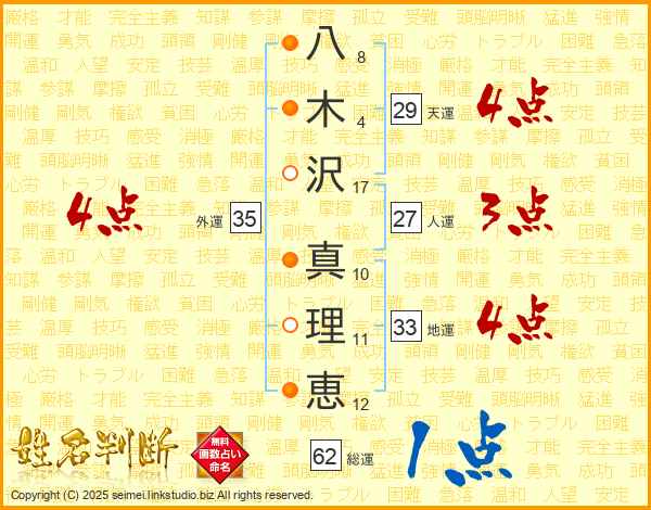 八(8画)木(4画)沢(17画)  真(10画)理(11画)恵(12画)