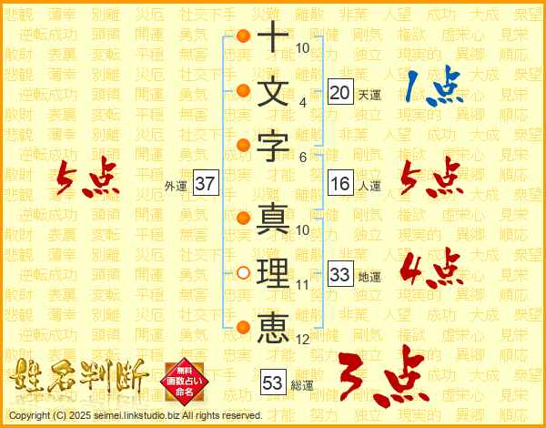 十(10画)文(4画)字(6画) 真(10画)理(11画)恵(12画)