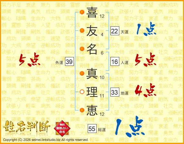 喜(12画)友(4画)名(6画) 真(10画)理(11画)恵(12画)