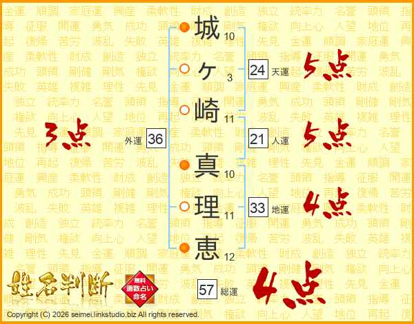 城(10画)ヶ(3画)崎(11画) 真(10画)理(11画)恵(12画)