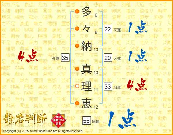 多(6画)々(6画)納(10画) 真(10画)理(11画)恵(12画)