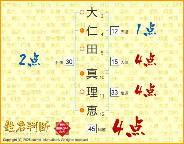 大(3画)仁(4画)田(5画) 真(10画)理(11画)恵(12画)