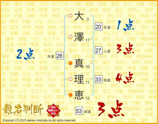 大(3画)澤(17画) 真(10画)理(11画)恵(12画)