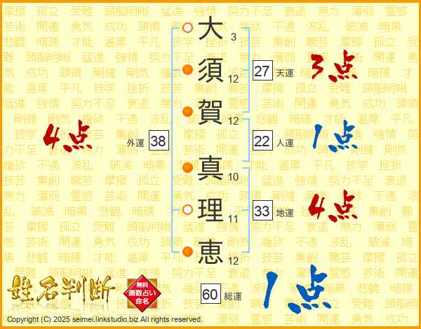 大(3画)須(12画)賀(12画) 真(10画)理(11画)恵(12画)