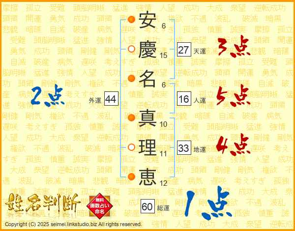 安(6画)慶(15画)名(6画) 真(10画)理(11画)恵(12画)