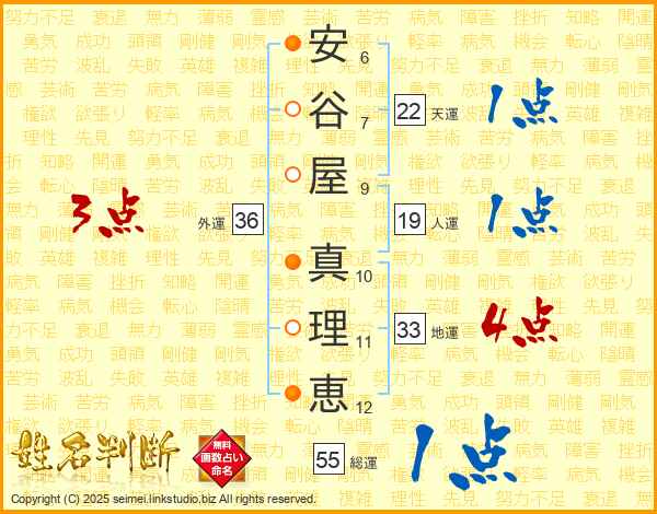 安(6画)谷(7画)屋(9画) 真(10画)理(11画)恵(12画)