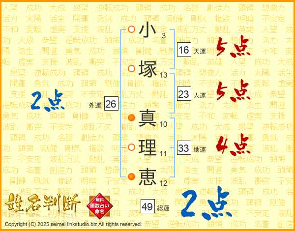 小(3画)塚(13画) 真(10画)理(11画)恵(12画)