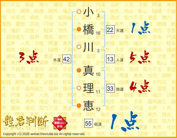 小(3画)橋(16画)川(3画) 真(10画)理(11画)恵(12画)