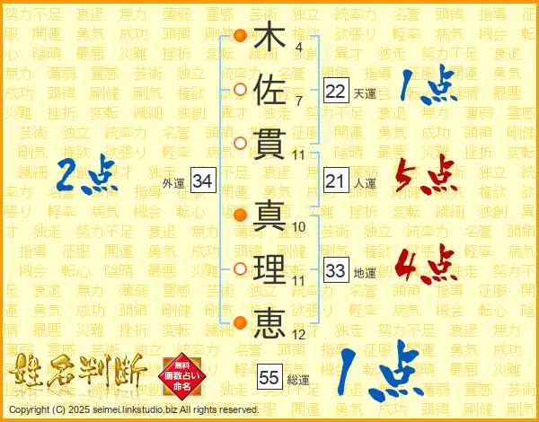 木(4画)佐(7画)貫(11画) 真(10画)理(11画)恵(12画)