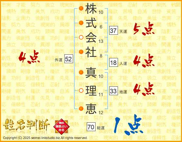株(10画)式(6画)会(13画)社(8画) 真(10画)理(11画)恵(12画)