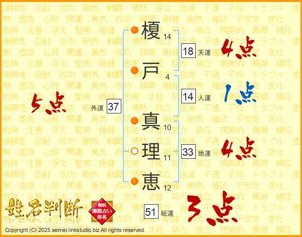 榎(14画)戸(4画) 真(10画)理(11画)恵(12画)