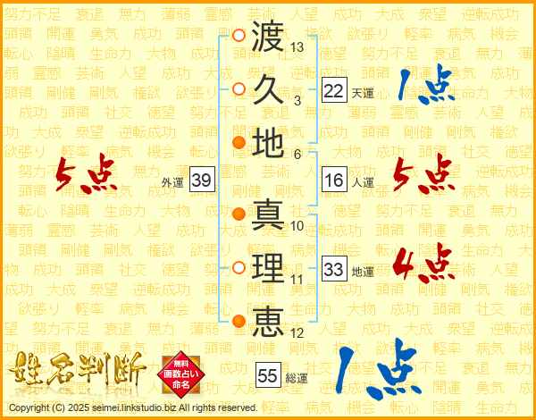 渡(13画)久(3画)地(6画) 真(10画)理(11画)恵(12画)
