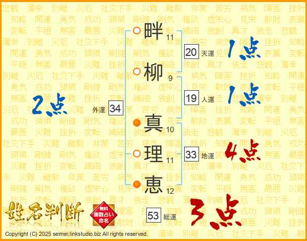 畔(11画)柳(9画) 真(10画)理(11画)恵(12画)