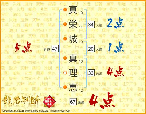 真(10画)栄(14画)城(10画) 真(10画)理(11画)恵(12画)
