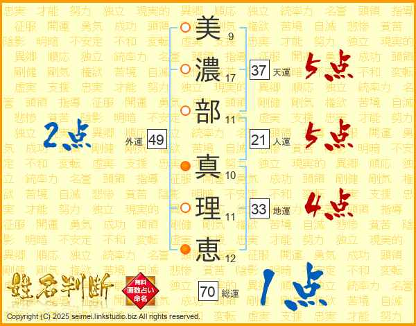 美(9画)濃(17画)部(11画) 真(10画)理(11画)恵(12画)