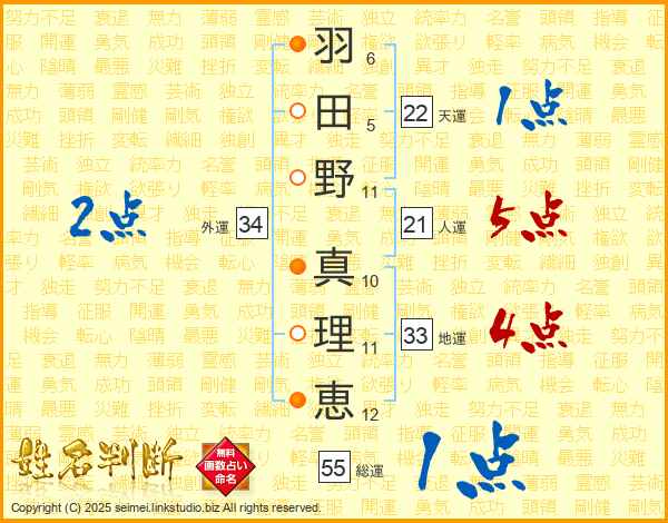 羽(6画)田(5画)野(11画) 真(10画)理(11画)恵(12画)