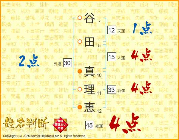 谷(7画)田(5画) 真(10画)理(11画)恵(12画)