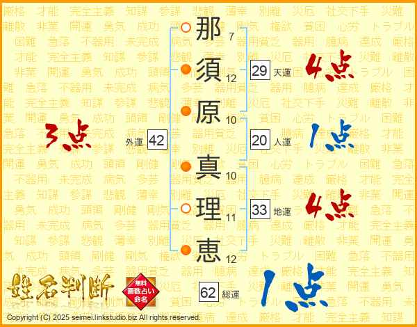 那(7画)須(12画)原(10画) 真(10画)理(11画)恵(12画)