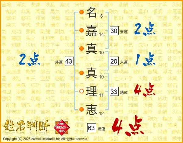 名(6画)嘉(14画)真(10画) 真(10画)理(11画)恵(12画)