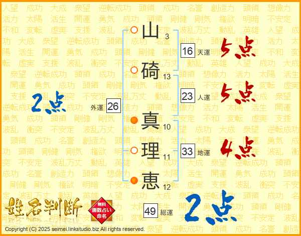 山(3画)碕(13画)  真(10画)理(11画)恵(12画)