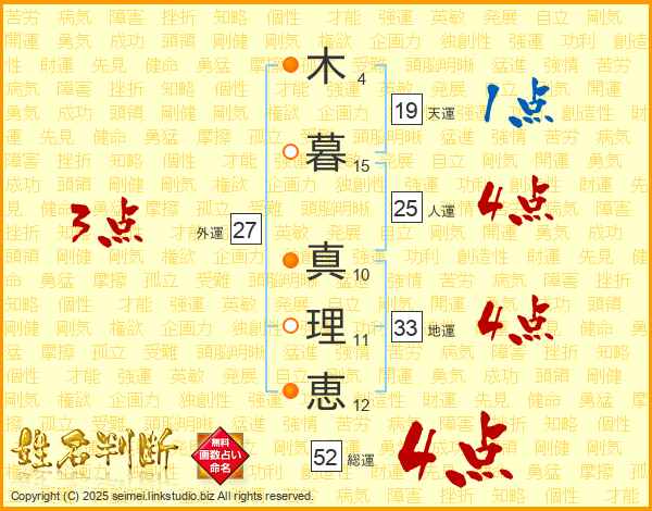 木(4画)暮(15画) 真(10画)理(11画)恵(12画)