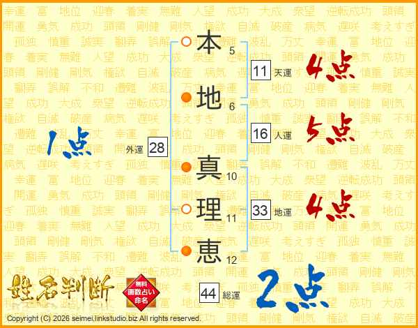 本(5画)地(6画) 真(10画)理(11画)恵(12画)