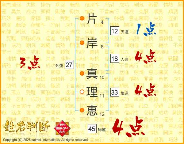 片(4画)岸(8画) 真(10画)理(11画)恵(12画)