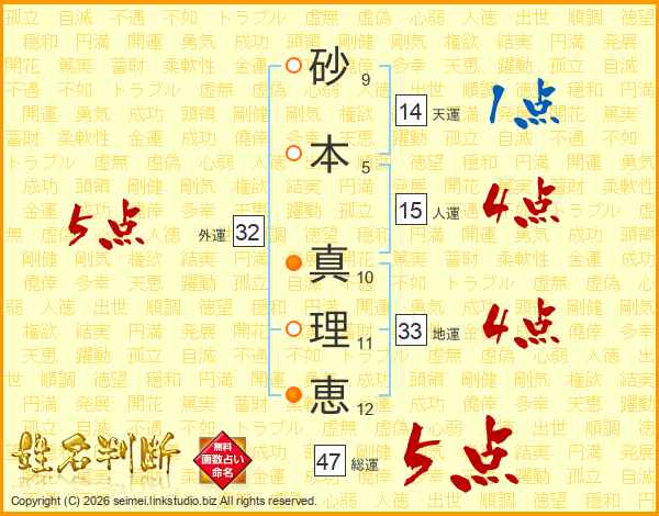 砂(9画)本(5画) 真(10画)理(11画)恵(12画)