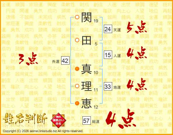 関(19画)田(5画) 真(10画)理(11画)恵(12画)