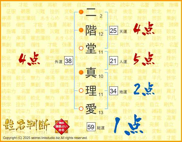 二(2画)階(12画)堂(11画) 真(10画)理(11画)愛(13画)