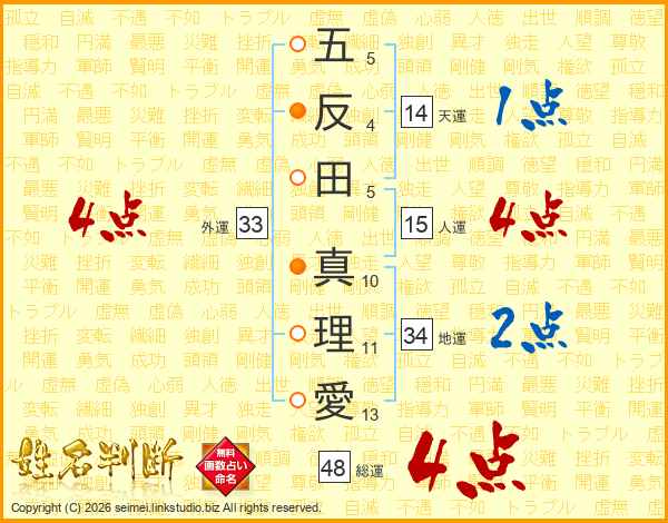 五(5画)反(4画)田(5画) 真(10画)理(11画)愛(13画)