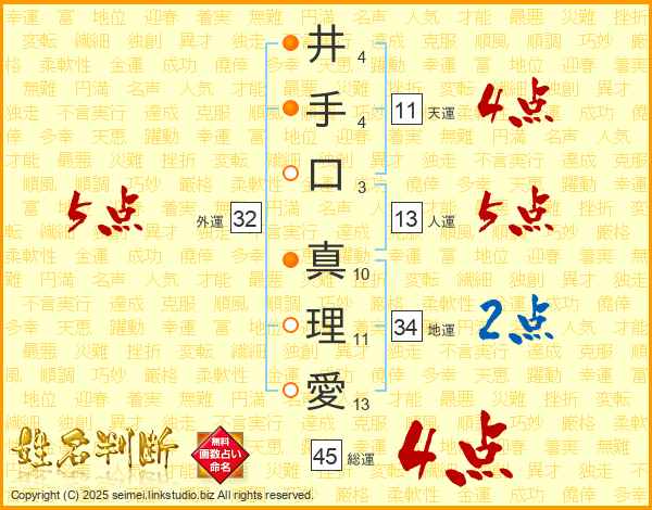 井(4画)手(4画)口(3画) 真(10画)理(11画)愛(13画)